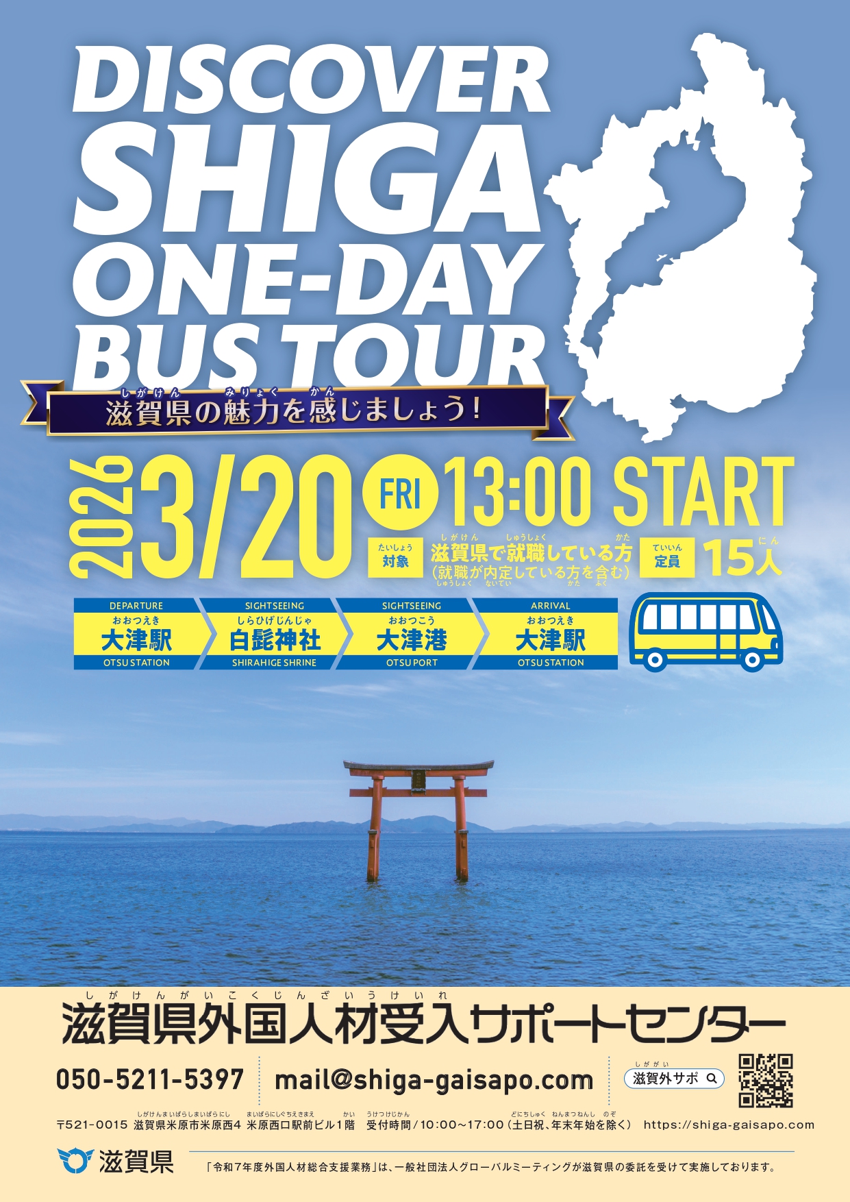 令和8年3月20日(祝) 12時 (JR大津駅 集合) ~18時 (JR大津駅 解散)滋賀県外国人材受入サポートセンターでは、県内で勤務されている(内定者を含む)外国人材の皆さまを対象に、滋賀県の「歴史」「文化」「ものづくり」の魅力を一度に体験できる無料のバスツアーを開催します!