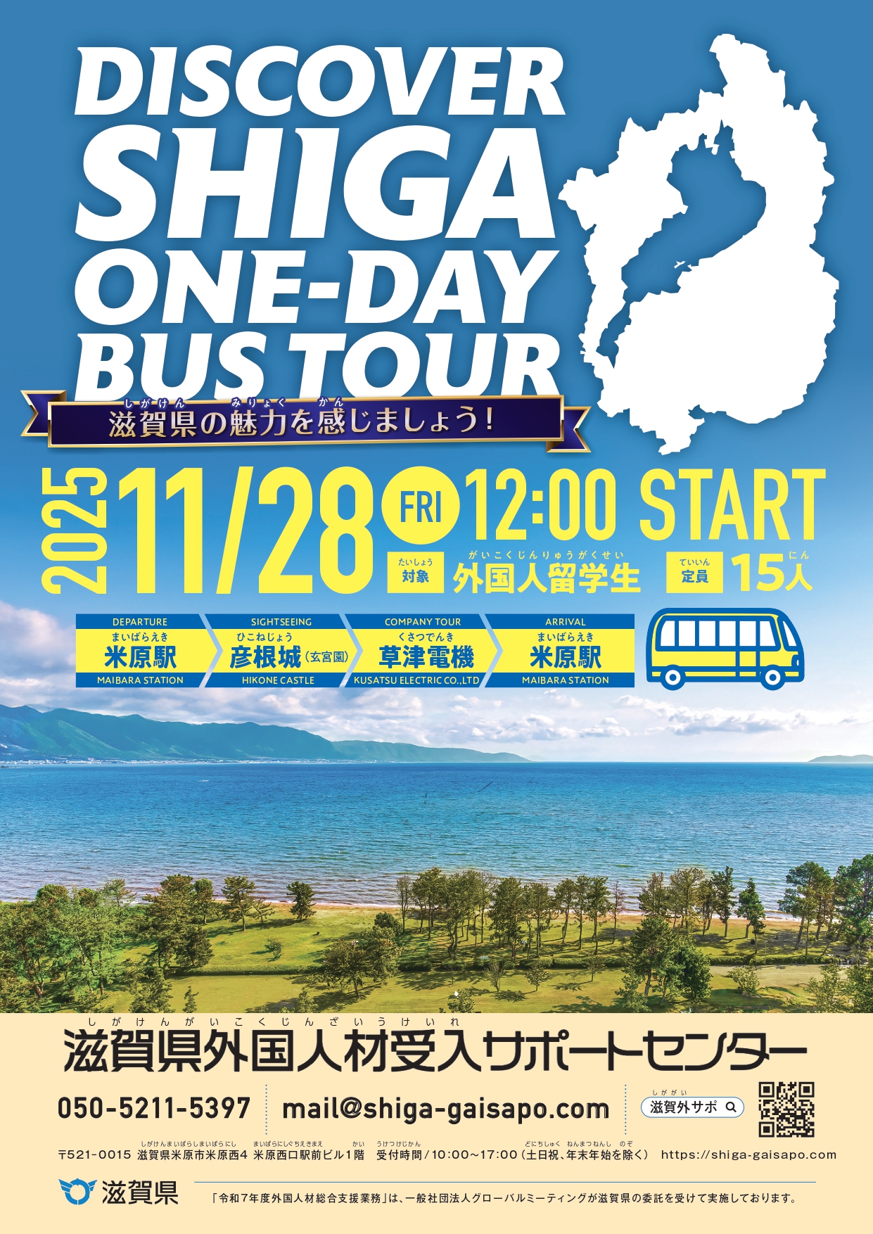 滋賀県外国人材受入サポートセンターでは、県内に在住・通学されている外国人留学生の皆さまを対象に、滋賀県の「歴史」「文化」「ものづくり」の魅力を一度に体験できる無料のバスツアーを開催します!